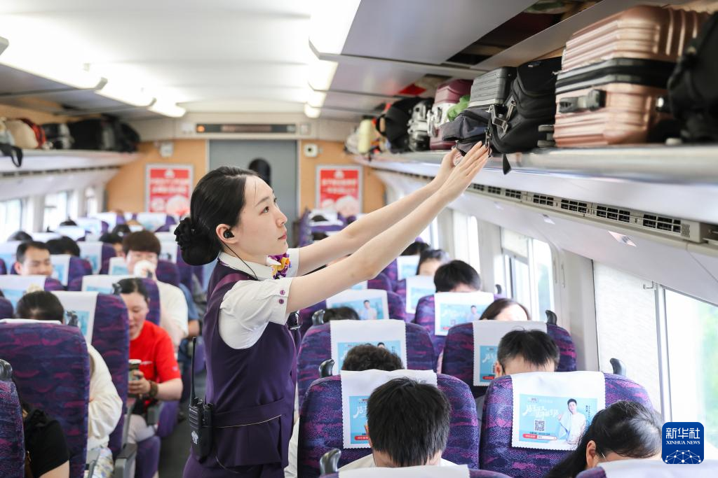 7月15日,在G8389次高铁列车上,乘务员在车厢内整理行李。新华社发(苏阳摄)