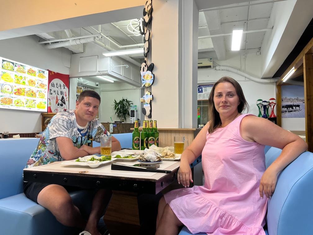 7月13日,俄罗斯游客奥尔加(右)和丈夫在中国餐厅用餐。新华社记者 陈子薇 摄