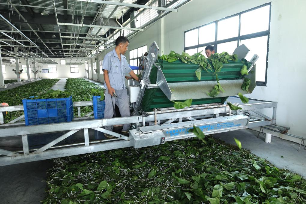 一家蚕桑工厂内,工人们正操作机器进行养蚕作业。新华社记者 林胜概 摄