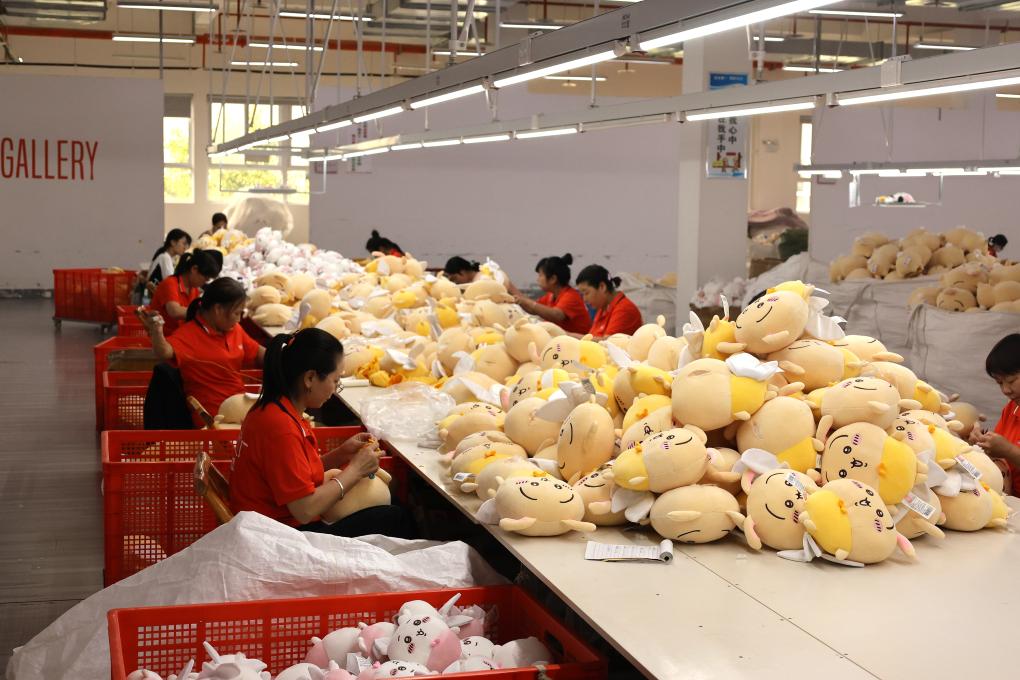 在一家毛绒玩具厂内,工人们正在对玩具产品进行加工。新华社记者 林胜概 摄