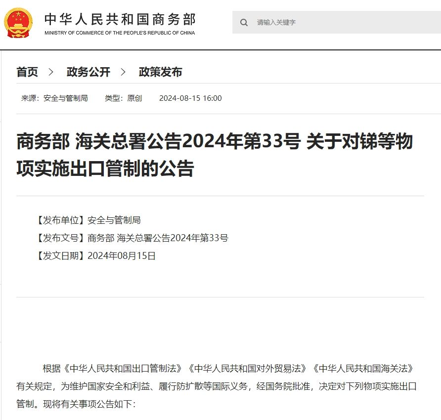 商务部 海关总署公告2024年第33号 关于对锑等物项实施出口管制的公告