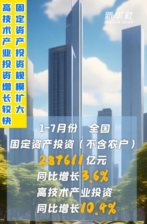 固定资产投资规模扩大,高技术产业投资增长较快。1-7月份,全国固定资产投资(不含农户)287611亿元,同比增长3.6%,高技术产业投资同比增长10.4%。