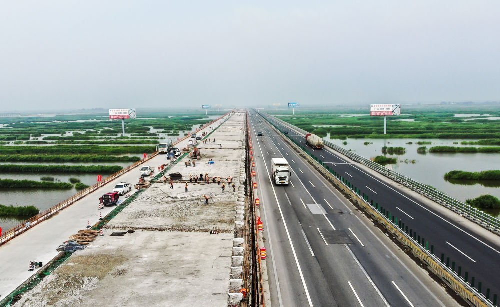 2024年7月4日,在京哈高速公路辽宁段改扩建工程项目施工现场,中铁四局建设者进行桥面施工作业(无人机照片)。新华社记者 杨青 摄