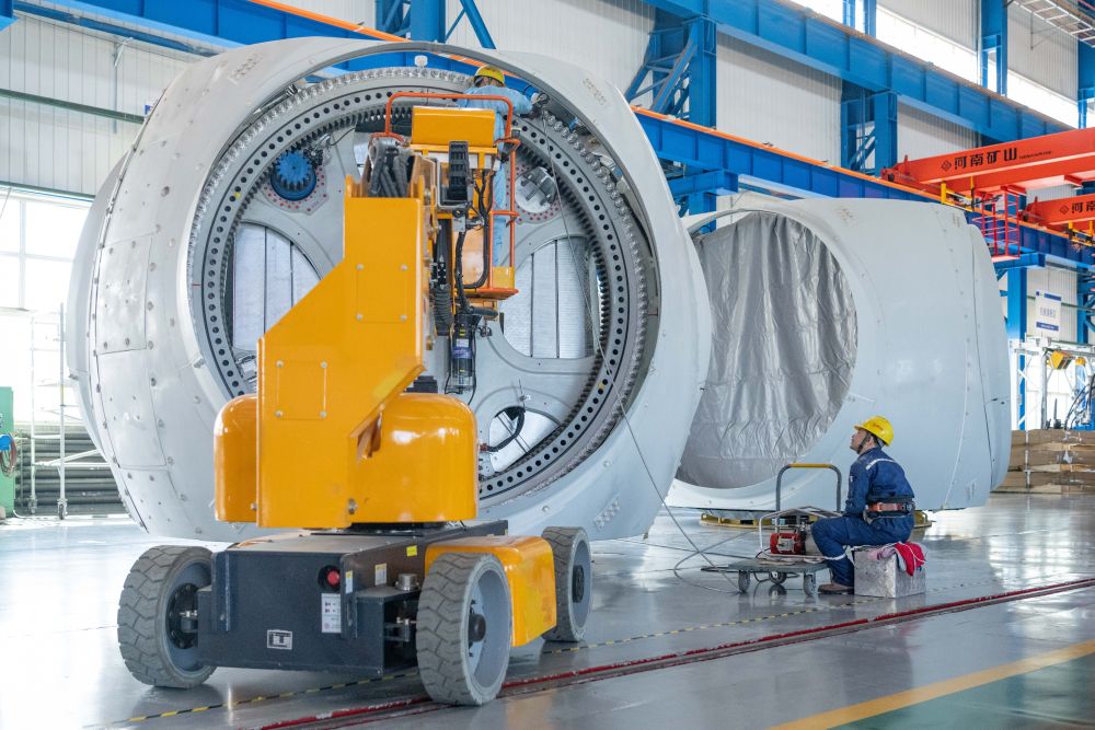 2024年4月28日,工人在位于黑龙江省齐齐哈尔市的中国一重集团有限公司风电设备装配车间加工风电轮毂。新华社记者 谢剑飞 摄