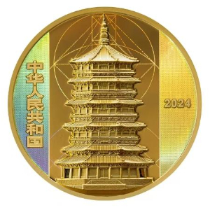 该套金银纪念币正面图案均为应县佛宫寺释迦塔正南面,辅以立面构图分析线,并刊国名、年号。
