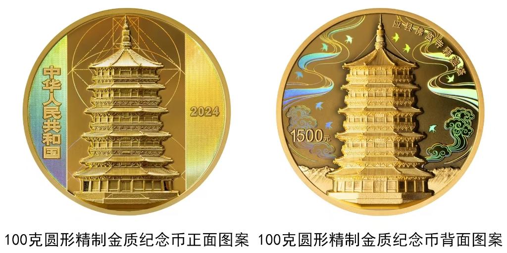 100克圆形金质纪念币背面图案为应县佛宫寺释迦塔正北面,辅以麻燕、祥云、远山等组合设计,并刊“应县佛宫寺释迦塔”字样及面额,最大发行量600枚。
