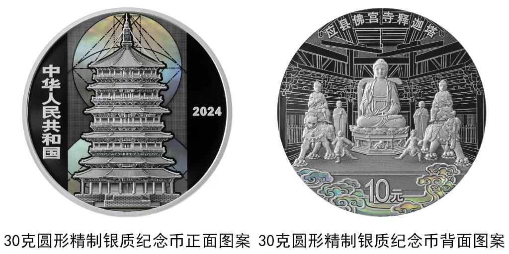 30克圆形银质纪念币背面图案为应县佛宫寺释迦塔内第四层造像全景,辅以祥云、塔内结构局部等组合设计,并刊“应县佛宫寺释迦塔”字样及面额,最大发行量20000枚。
