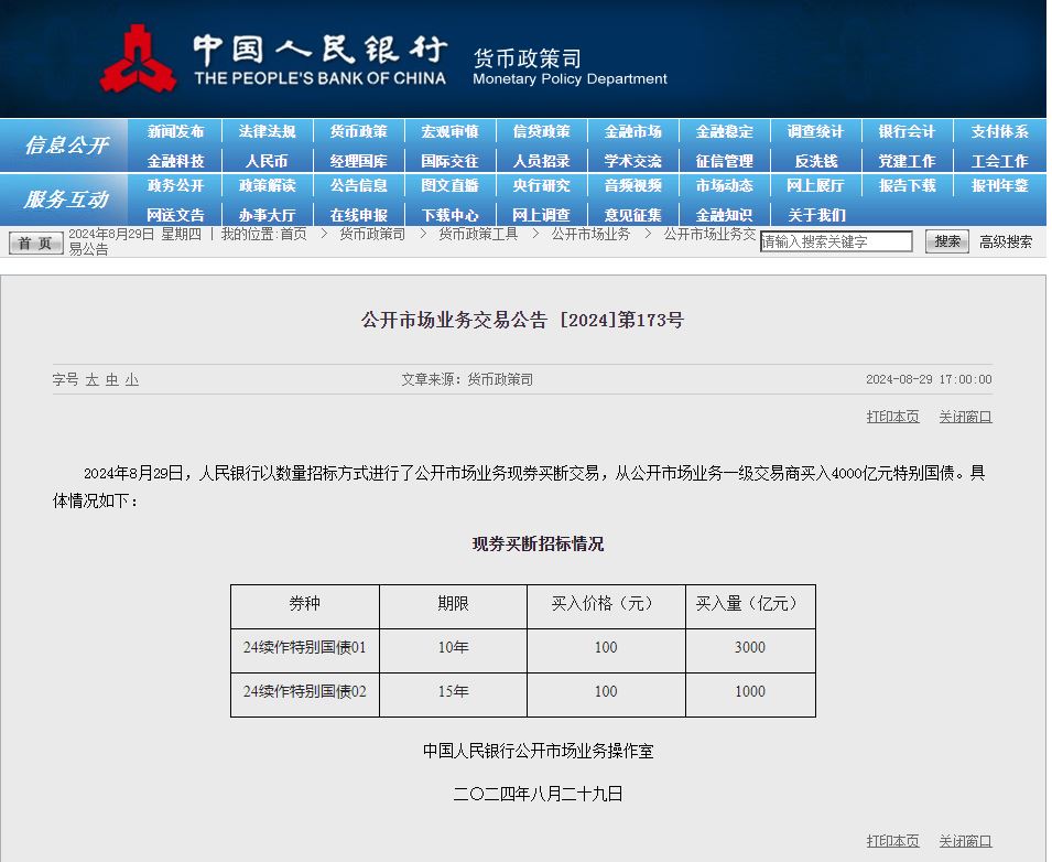中国人民银行8月29日公布的公开市场业务交易公告显示,当日中国人民银行以数量招标方式进行了公开市场业务现券买断交易,从公开市场业务一级交易商买入4000亿元特别国债。