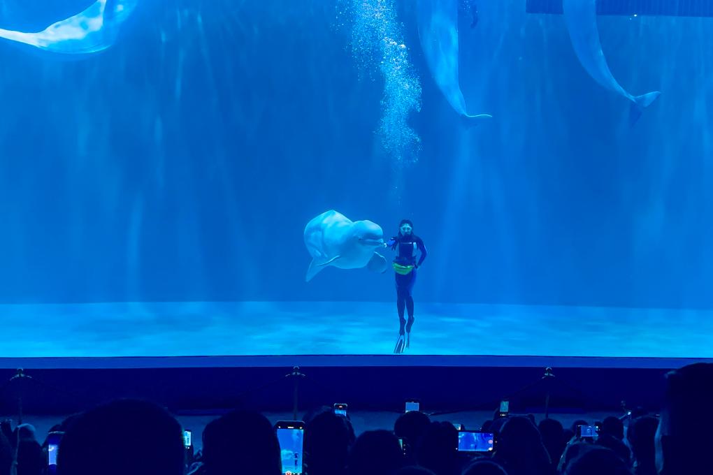 游客在观看哈尔滨极地公园的白鲸秀(8月23日摄)。新华社记者 杨思琪 摄