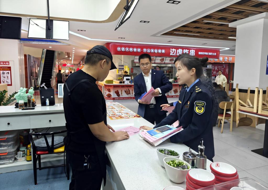 山西省运城市市场监督管理局和保险公司工作人员主动上门为个体工商户介绍“惠商保”项目情况。新华社记者王飞航 摄