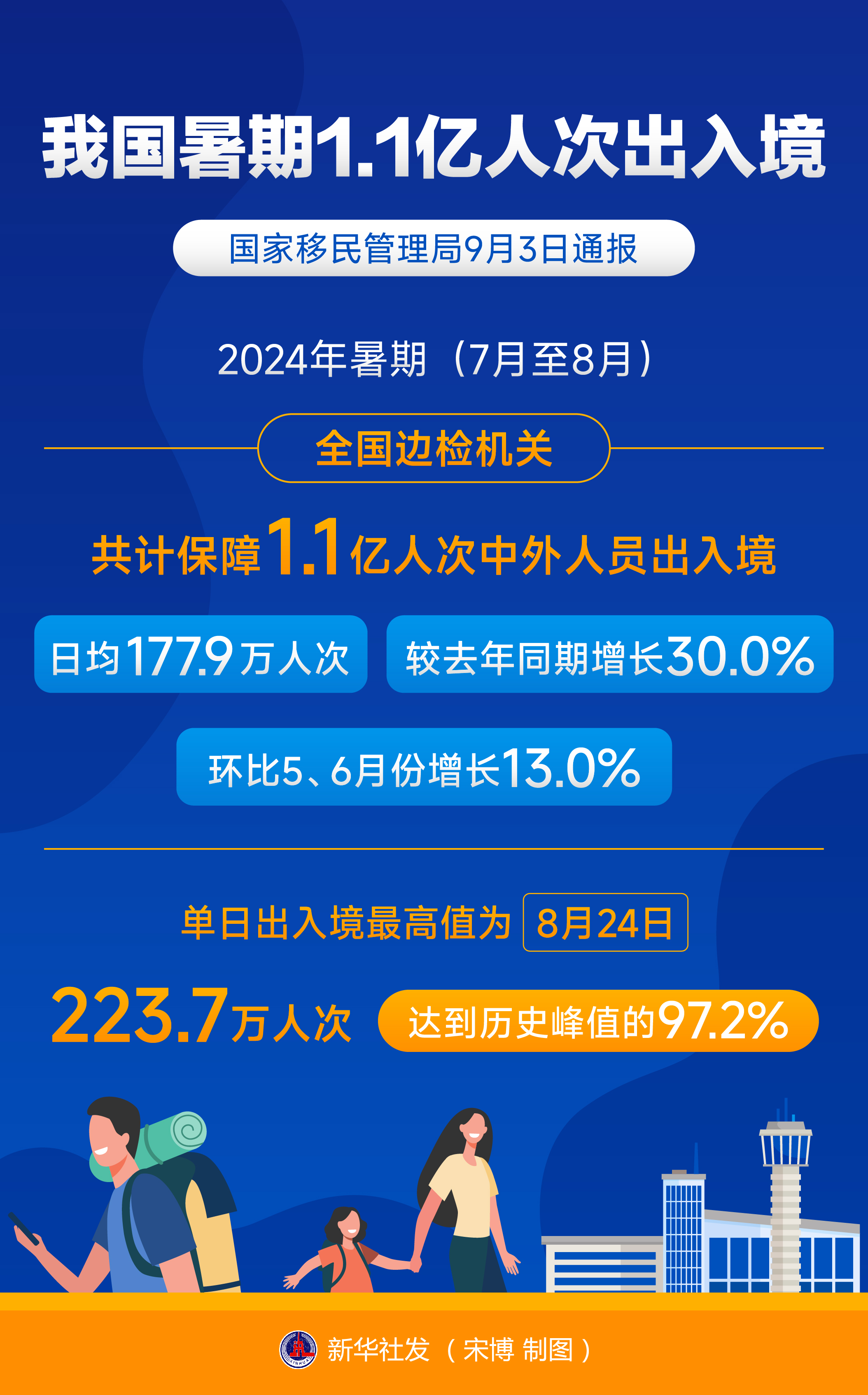 新华社北京9月3日电(记者任沁沁)随着互免签证、144小时过境免签等利好政策的实施,不少中外游客选择在暑期开启“双向奔赴”的跨境游旅程。国家移民管理局3日通报,今年暑期(7月至8月)全国边检机关共计保障1.1亿人次中外人员出入境,日均177.9万人次,较去年同期增长30.0%,环比5、6月份增长13.0%。单日出入境最高值为8月24日的223.7万人次,达到历史峰值的97.2%。