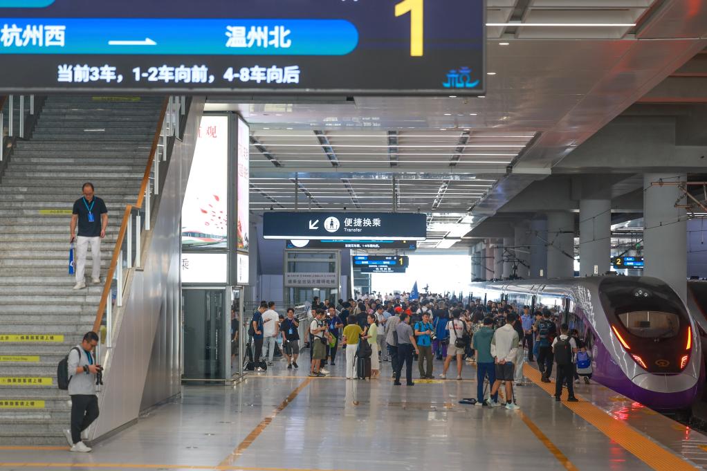 9月6日,从杭州西站开出的首发列车抵达温州北站。新华社记者 江汉 摄