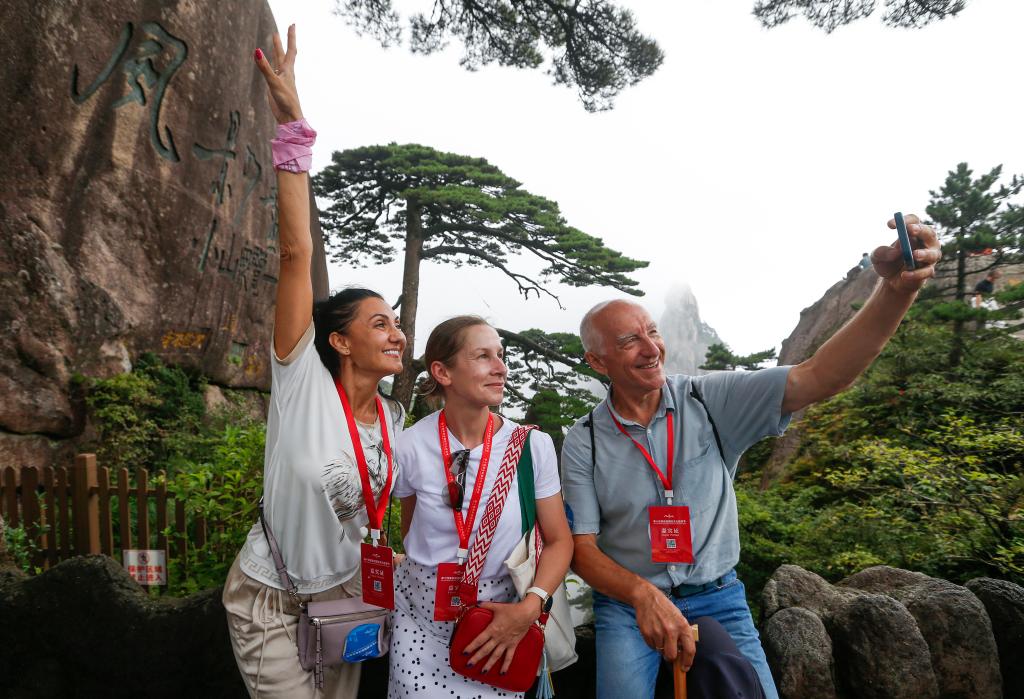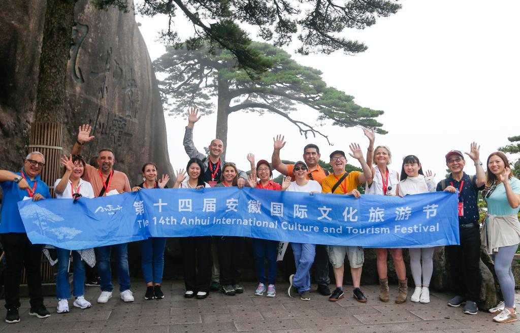 9月12日,境外旅行商们在黄山风景区的迎客松前集体合影留念。新华社发(施亚磊摄)