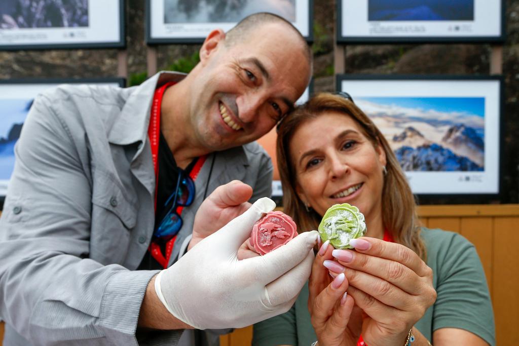 9月12日,在安徽黄山,以色列旅行商梅尔·金(左)与同伴体验手工月饼。新华社发(施亚磊摄)
