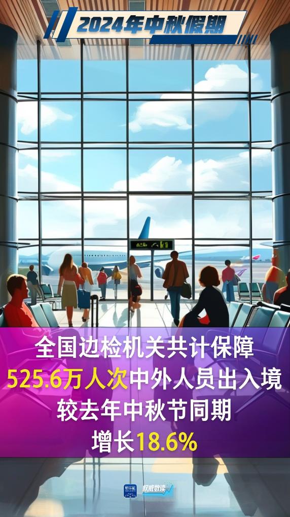国家移民管理局18日通报,今年中秋节期间全国边检机关共计保障525.6万人次中外人员出入境,日均175.2万人次,较去年中秋假期同期增长18.6%。
