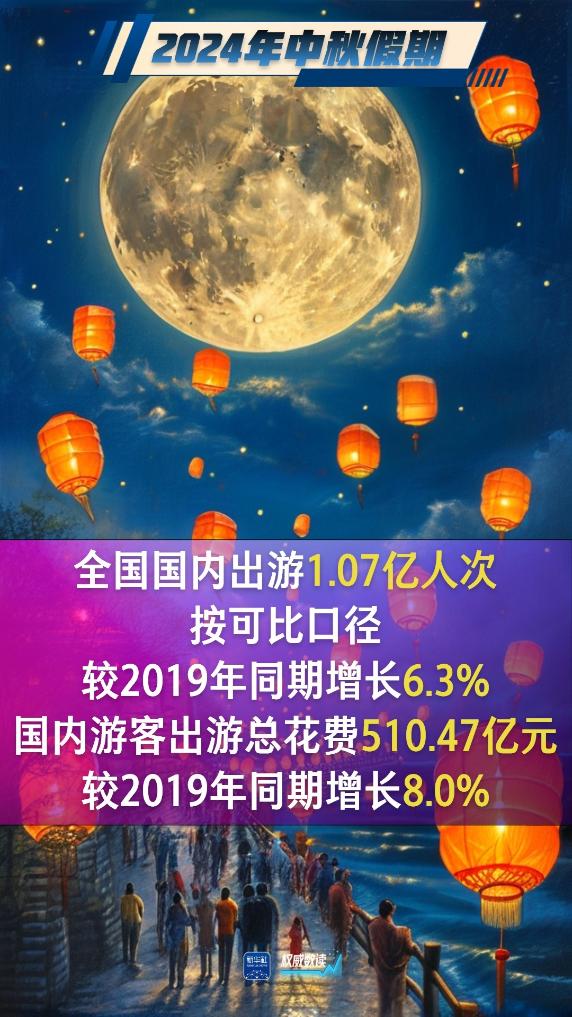 2024年中秋节假期,全国文化和旅游市场总体平稳有序。据文化和旅游部数据中心测算,全国国内出游1.07亿人次,按可比口径较2019年同期增长6.3%;国内游客出游总花费510.47亿元,较2019年同期增长8.0%。