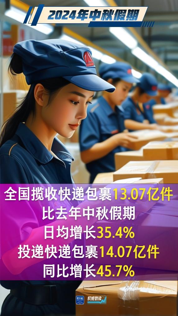 国家邮政局监测数据显示,今年中秋节假期,全国邮政快递业运行总体平稳,揽收快递包裹13.07亿件,比去年中秋假期日均增长35.4%;投递快递包裹14.07亿件,同比增长45.7%。