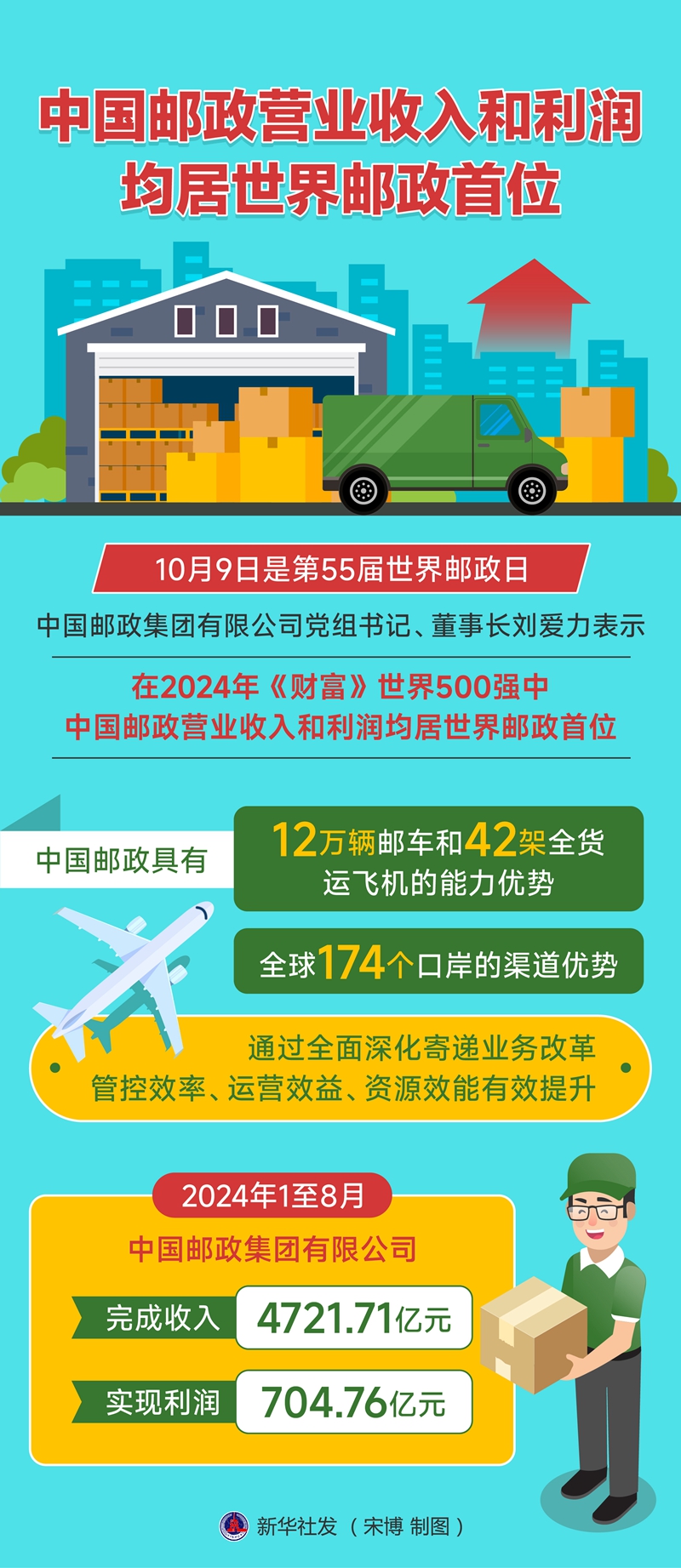 新华社北京10月9日电(记者赵文君)10月9日是第55届世界邮政日。中国邮政集团有限公司党组书记、董事长刘爱力在世界邮政日致辞中说,在2024年《财富》世界500强中,中国邮政营业收入和利润均居世界邮政首位。