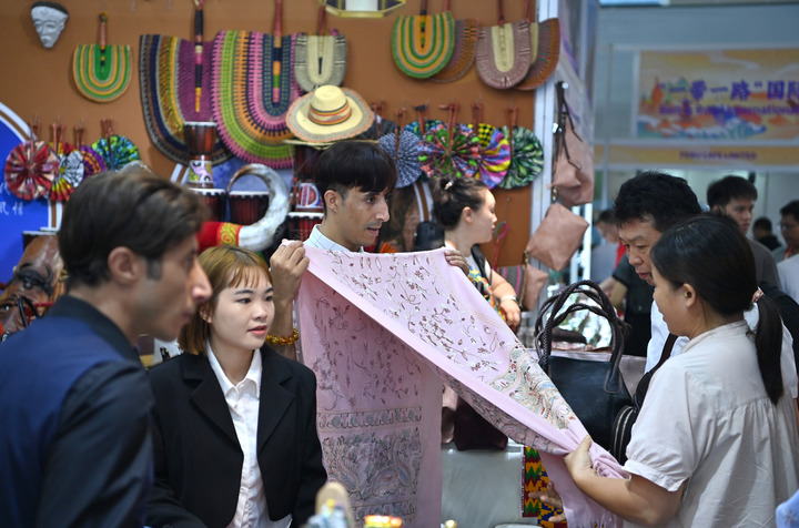 9月27日,也门客商在中国—东盟博览会“一带一路”国际商品展区向观众介绍一款丝巾。新华社记者 周华 摄