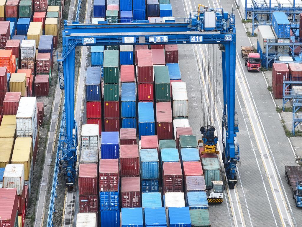 南通港通海港区大型机械在吊运集装箱(无人机照片)。新华社记者 季春鹏 摄