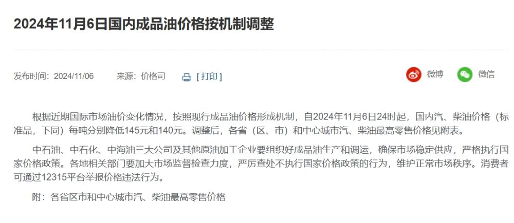 根据近期国际市场油价变化情况,按照现行成品油价格形成机制,自2024年11月6日24时起,国内汽、柴油价格(标准品,下同)每吨分别降低145元和140元。调整后,各省(区、市)和中心城市汽、柴油最高零售价格见附表。