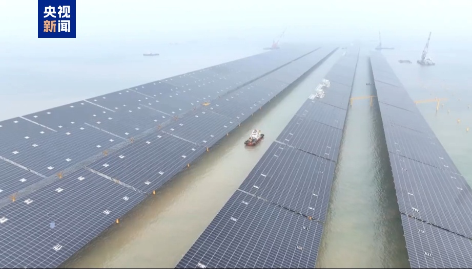 总台央视记者 古峻岭:海上光伏和陆地光伏项目另一个明显的不同,就是陆地光伏一般都是在现场进行组装。而在这里,都是在岸上把光伏板和支架组装好之后,再通过拖船整体把它运到现场,再通过吊装的方式,吊装在事先预埋好的四个钢桩上。我注意到每个光伏板上都有一些漏孔,这些就是吊装时钢缆悬挂的吊点,全部安装完成后,还要把这些漏孔处的光伏板给补全。