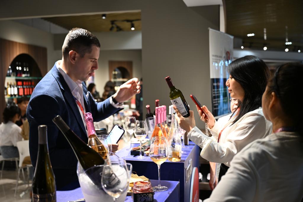 外商向侨博会游客介绍自家的葡萄酒产品。新华社记者刘铭翔 摄