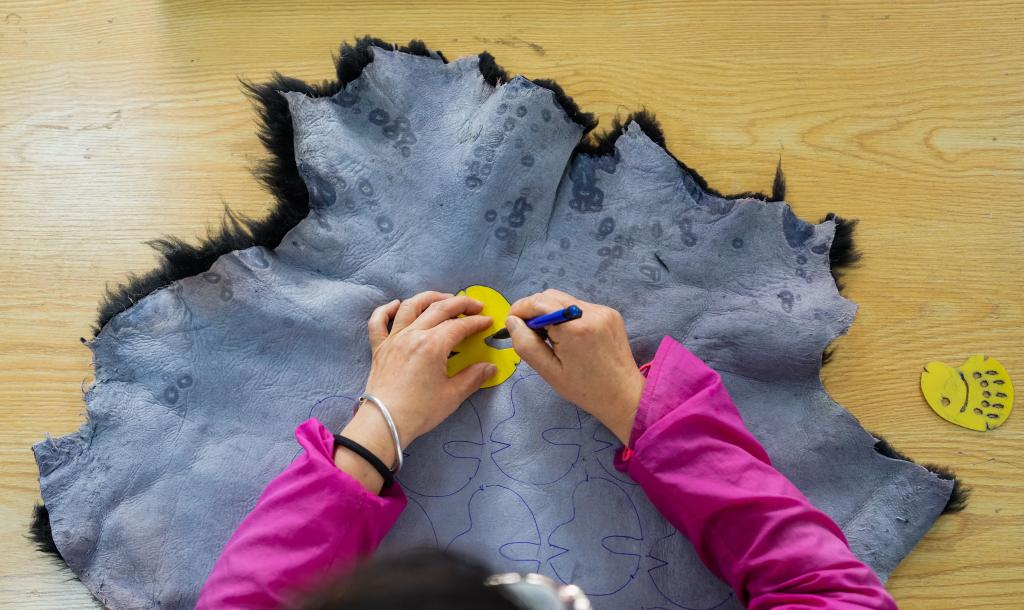 在位于四川省成都市的“西柚熊猫”生产车间,工人剪裁用于制作高仿真大熊猫玩偶部件的羊皮(11月21日摄)。新华社记者 沈伯韩 摄