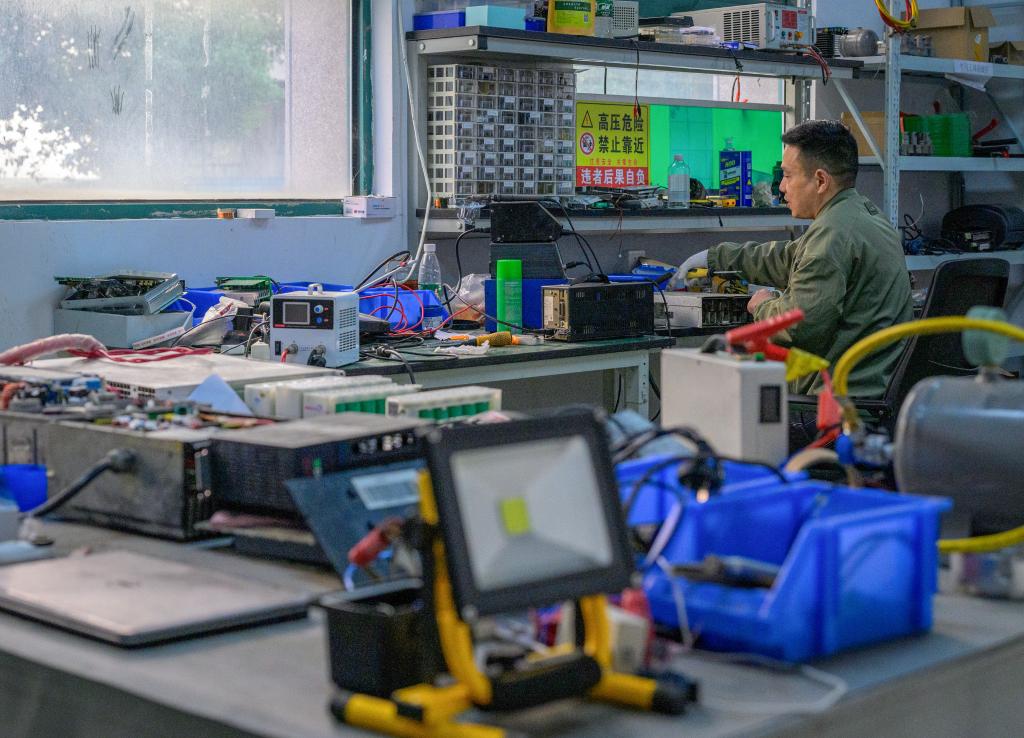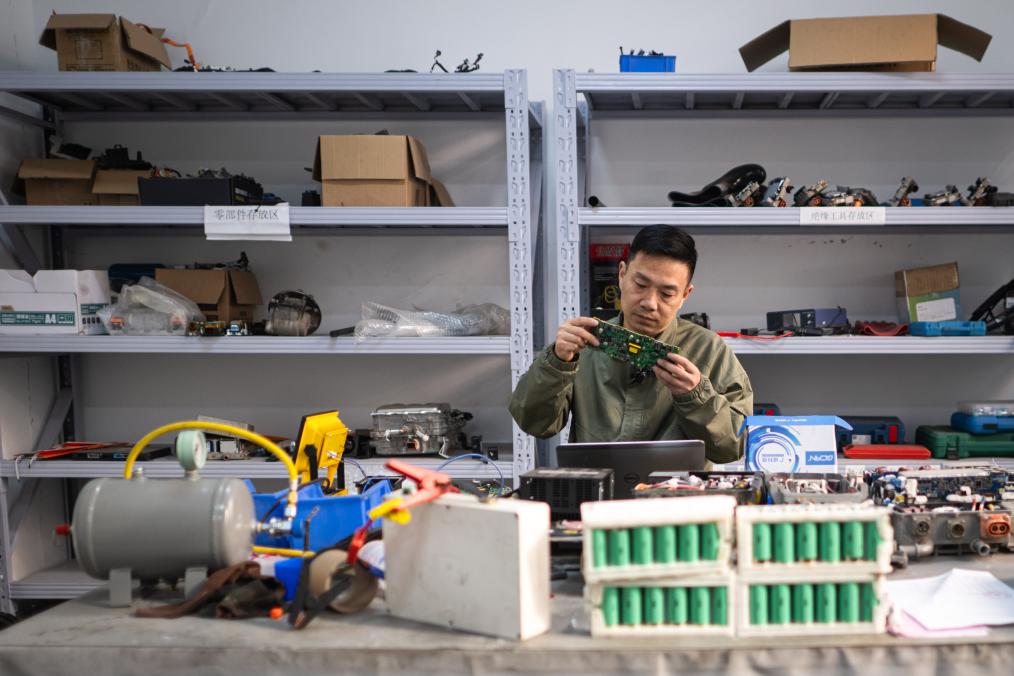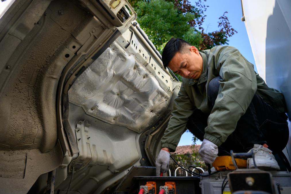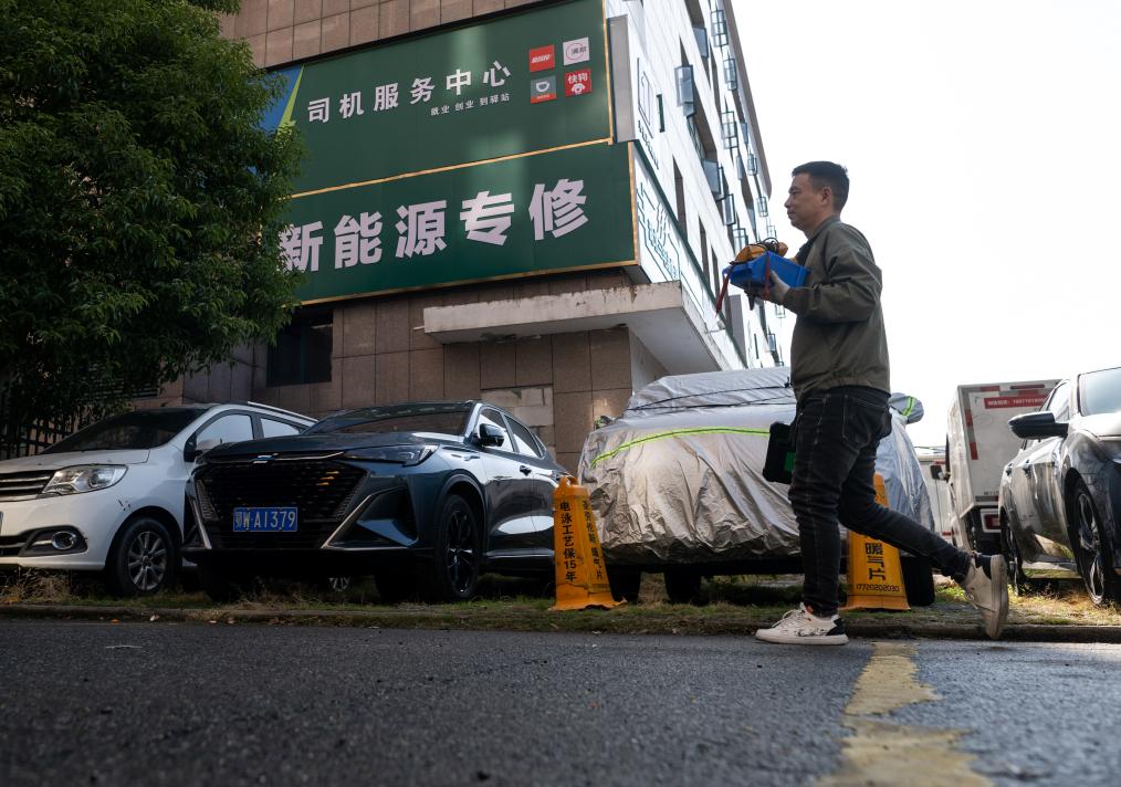 12月5日,李培伟在新能源汽车修理店忙碌。