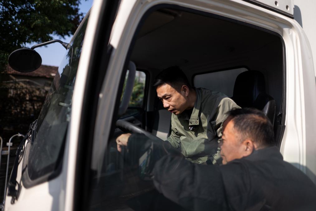 12月5日,李培伟(左)与新能源货车车主交流维修事宜。