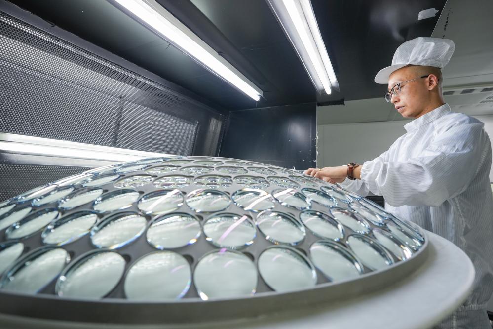 在万新光学的定制镜片车房加工中心,经过十几道工序设计打磨后的镜片,被放置在圆形托盘上,在真空镀膜机中强光“盖戳”后,再镀上不同类别的光学薄膜。依托智能化车间的前沿技术装备,量身打造的功能型镜片,可以把误差控制在纳米级。