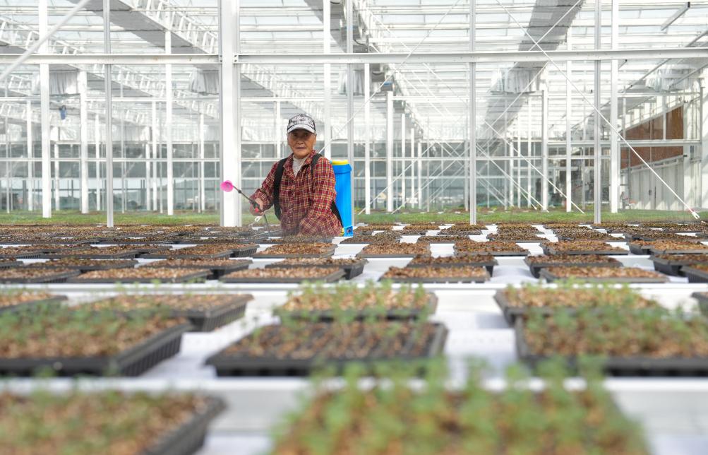 图为工人在大棚内浇水育苗。新华社记者周佳谊 摄