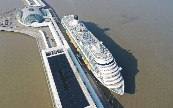 2024年1月1日,“爱达·魔都号”停靠在上海吴淞口国际邮轮港(无人机照片)。新华社记者 丁汀 摄