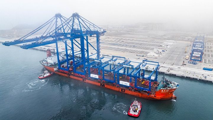2024年6月27日,岸边集装箱起重机和轨道吊运抵秘鲁钱凯港。新华社发(上海振华重工供图)