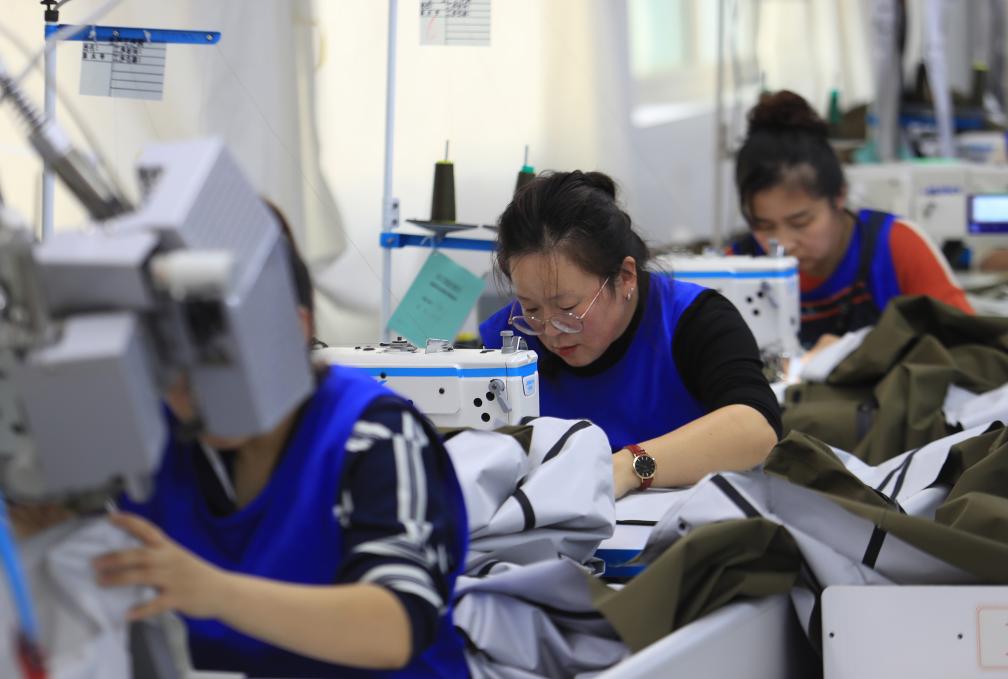 在辽宁飞马特实业有限公司,工作人员在车间加工滑雪服(2024年11月15日摄)。新华社记者 杨青 摄