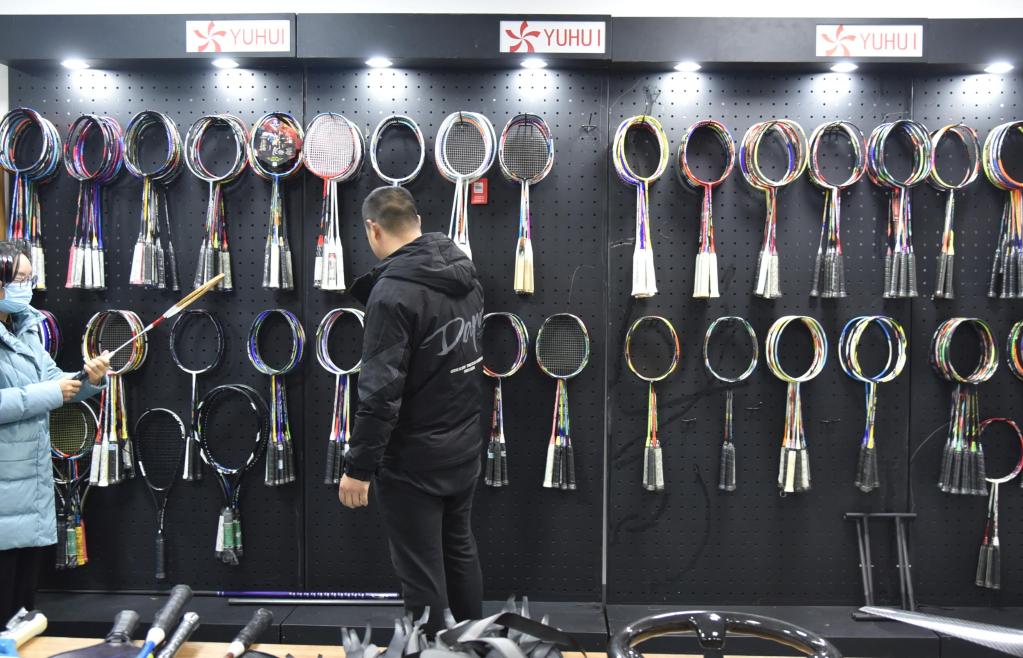 敦寨镇的羽毛球,还衍生出了包括羽毛球拍等产品和包装在内的众多下游企业。其中一家公司生产的碳纤维羽毛球拍,每月可达3万支,大部分产品出口到东南亚等海外市场。