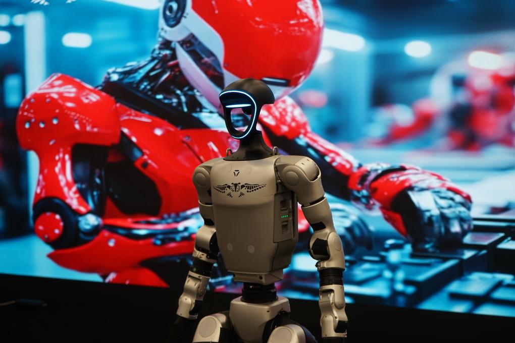 1月8日,在美国拉斯维加斯消费电子展上,人们在宇树科技展区观看机器人展示。