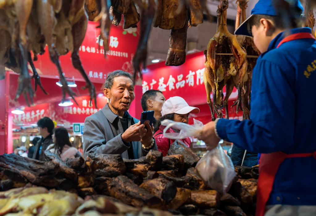 2025年1月14日,顾客在昆明滇池国际会展中心购买肉类腌制品。新华社发(彭奕凯 摄)
