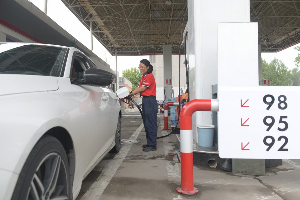 2024年6月13日,河北省新乐市一家加油站的工作人员给汽车加油。新华社发(贾敏杰 摄)