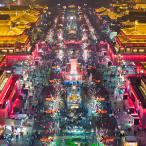 游客在西安大唐不夜城游玩(2024年2月2日摄,无人机照片)。 新华社记者 邵瑞 摄