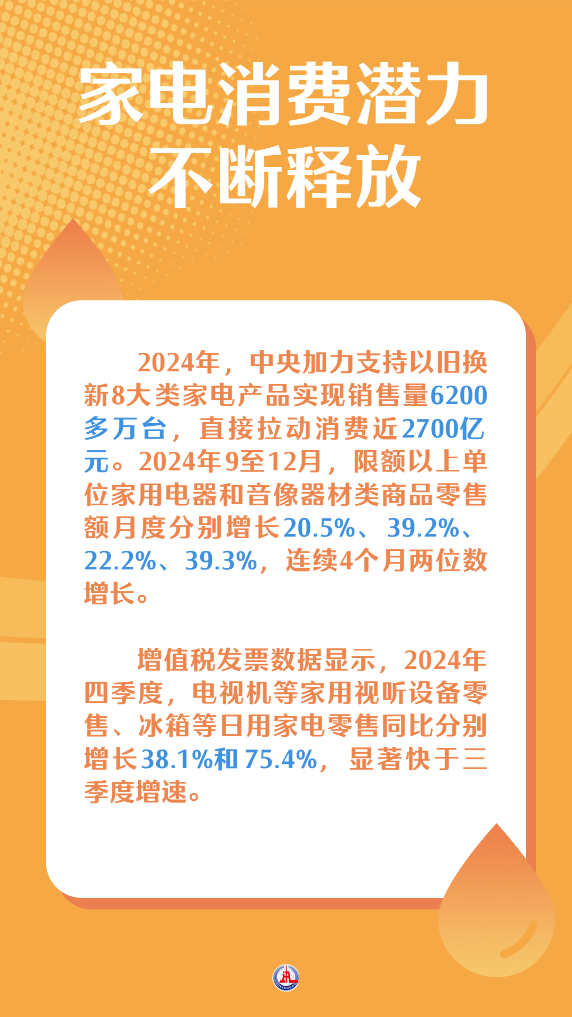 记者18日从商务部获悉,以旧换新政策对家电行业带动效应持续显现。据国家统计局数据,2024年限额以上单位家用电器和音像器材类商品零售额10307亿元,比上年增长12.3%,超过2017年9454亿元峰值并突破万亿元大关,创历史新高。
