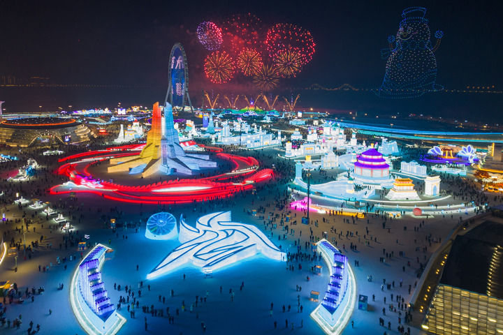 这是2025年1月5日拍摄的第41届中国·哈尔滨国际冰雪节现场上空的“烟花秀”(无人机照片)。新华社记者 张涛 摄