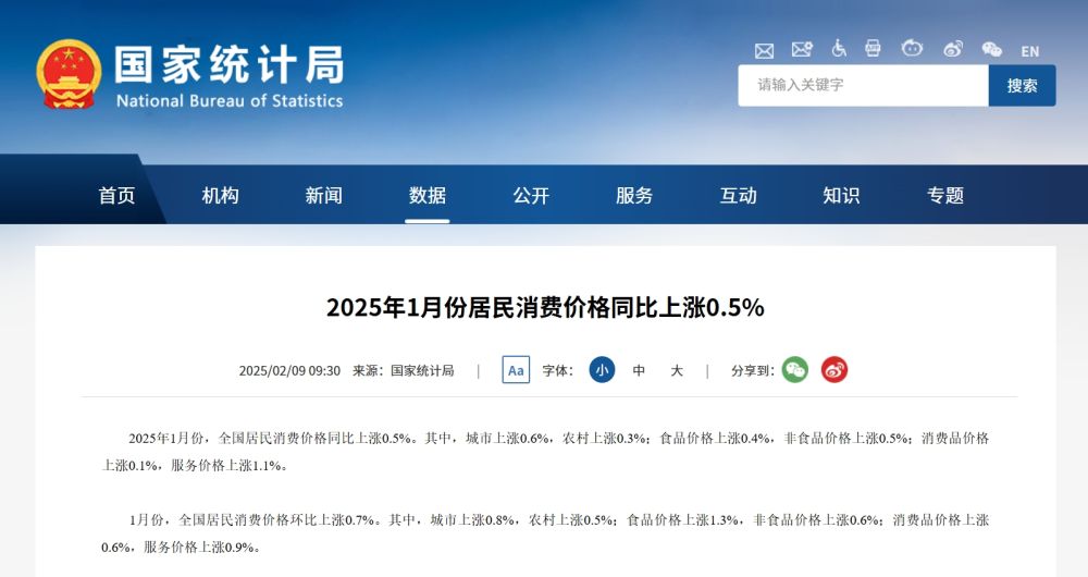 2025年1月份,全国居民消费价格同比上涨0.5%。其中,城市上涨0.6%,农村上涨0.3%;食品价格上涨0.4%,非食品价格上涨0.5%;消费品价格上涨0.1%,服务价格上涨1.1%。
