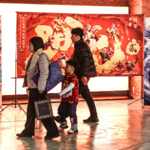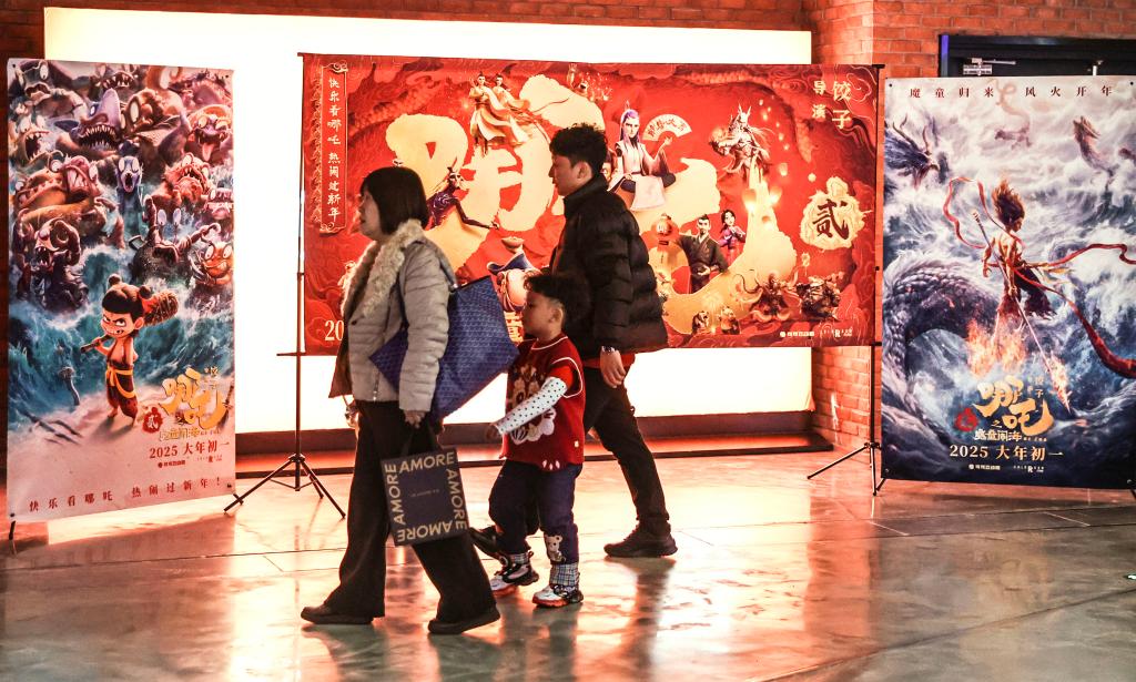 2月3日,在浙江省嘉兴市南湖区一家电影院,观众从电影海报旁走过。新华社发(金鹏摄)