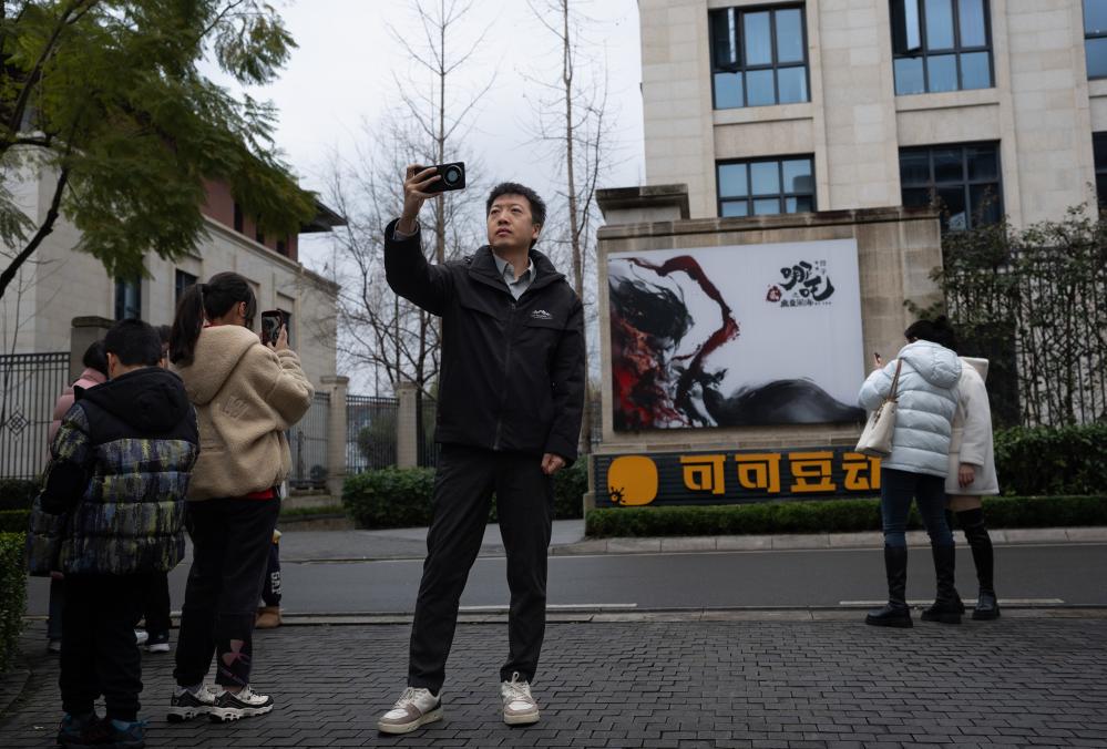2月8日,影迷们在成都可可豆动画影视有限公司前打卡。《哪吒》系列电影由成都可可豆动画影视有限公司出品制作。新华社记者 江宏景 摄