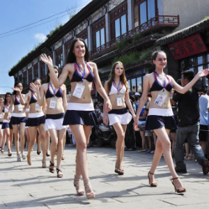 2011年8月16日,首届中国(葫芦岛·兴城)国际泳装文化节中参赛的中外模特走进兴城古城。新华社发