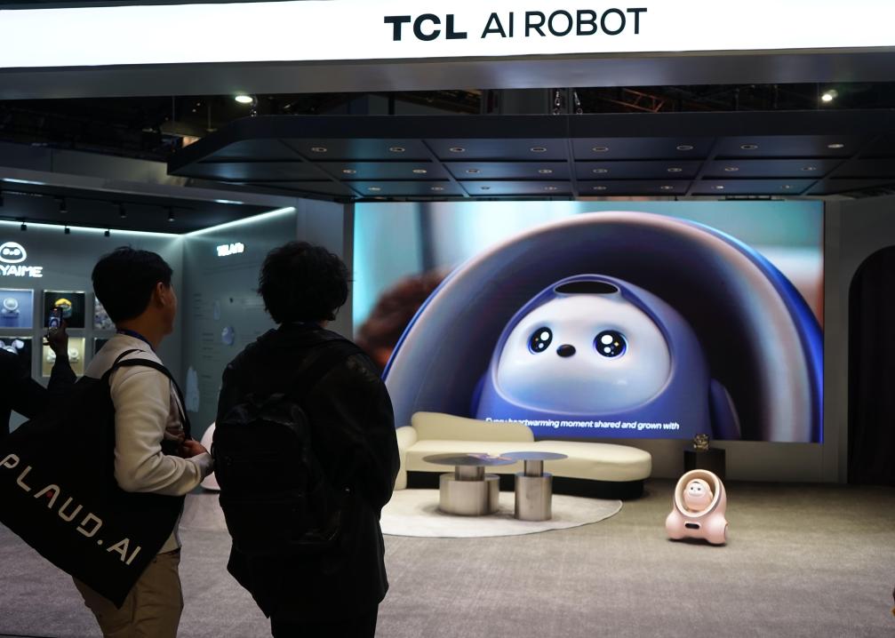 在美国拉斯维加斯消费电子展上,人们在TCL展区观看分体式AI陪伴机器人TCL Ai Me(2025年1月8日摄)。新华社发(曾慧摄)