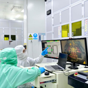 在山东日照,山东奥莱电子科技有限公司工作人员在生产设备前值守(2024年11月14日摄)。新华社记者 郭绪雷 摄