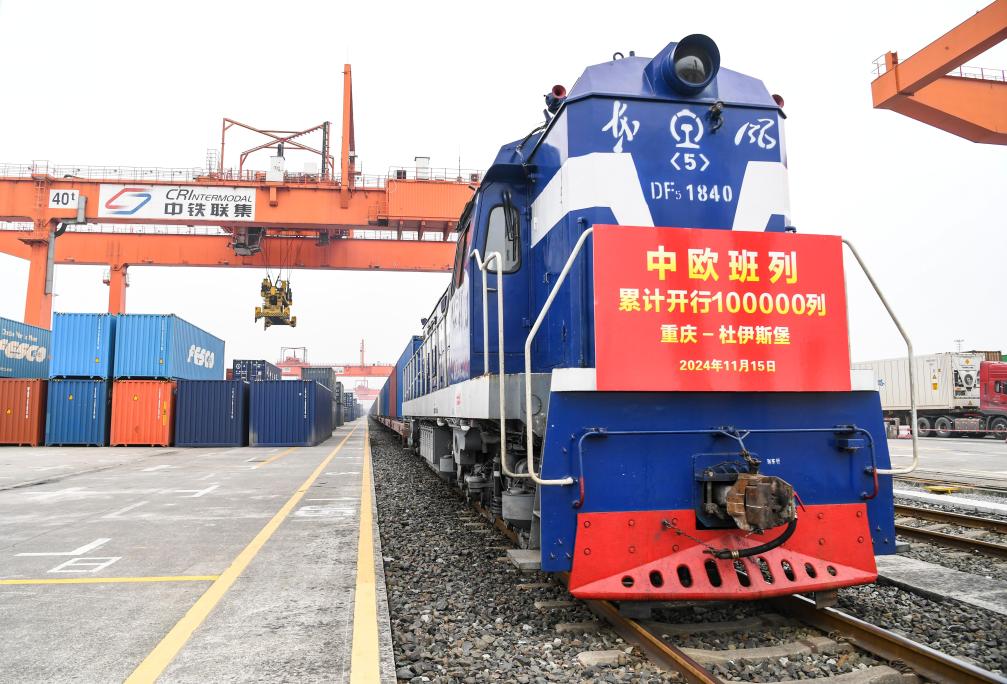 第10万列中欧班列——X8083次中欧班列(重庆—杜伊斯堡)在重庆团结村中心站准备发车(2024年11月15日摄)。新华社记者王全超摄