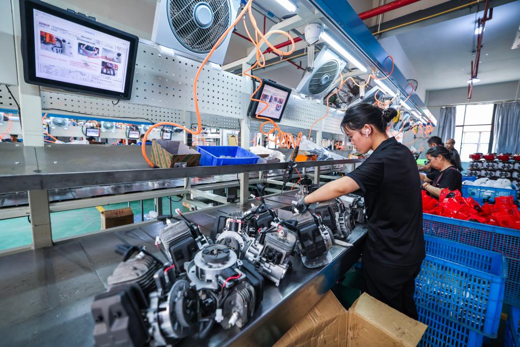在位于浙江省金华市的浙江托马斯工具制造有限公司数字化车间内,工人在流水线上生产出口的园林机械(2024年8月14日摄)。新华社记者徐昱摄
